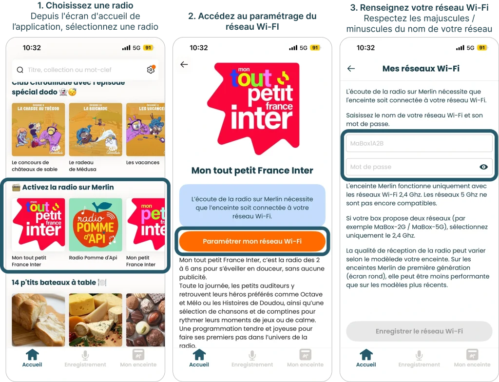 - Qualité de réception : La qualité de réception de la radio peut varier selon le modèle de votre enceinte. Sur les enceintes Merlin de 1ère génération (écran rond), elle peut être moins performante que sur les modèles plus récents.