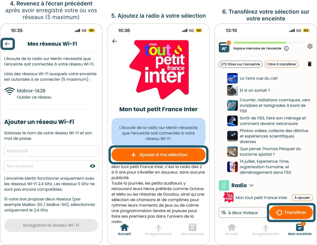 6. Transférez votre sélection sur votre enceinte. Une nouvelle section “Radio” apparaît sur l’écran de Merlin : c’est parti !