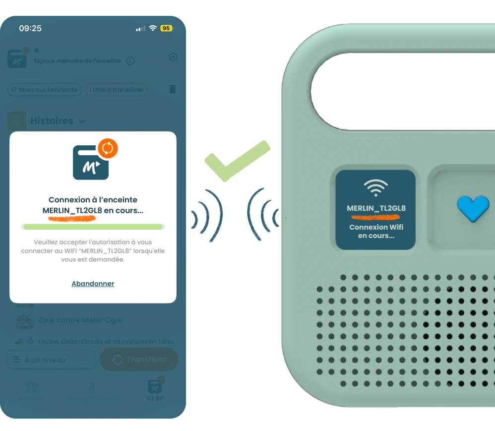 ⚠️ Les applications sont disponibles et fonctionnent dans la plupart des pays ; mais, en-dehors des frontières de la France, de la Belgique et de la Suisse, nous ne pouvons garantir le bon fonctionnement du transfert des contenus audio de l’application vers l’enceinte ; celui-ci peut rencontrer des dysfonctionnements liés à certains opérateurs téléphoniques, que le service client Merlin ne pourra malheureusement pas résoudre.