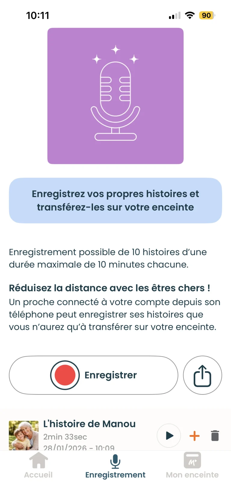 Enregistrez jusqu’à 10 histoires de 10 minutes maximum depuis l’application et transférez-les sur votre enceinte. Cette fonctionnalité est compatible avec toutes les enceintes Merlin.