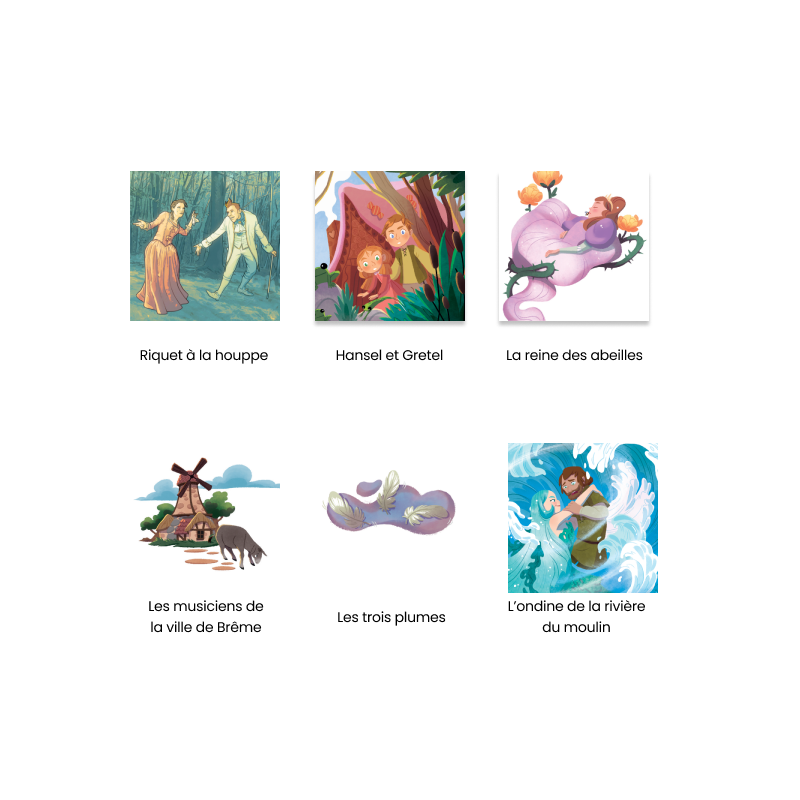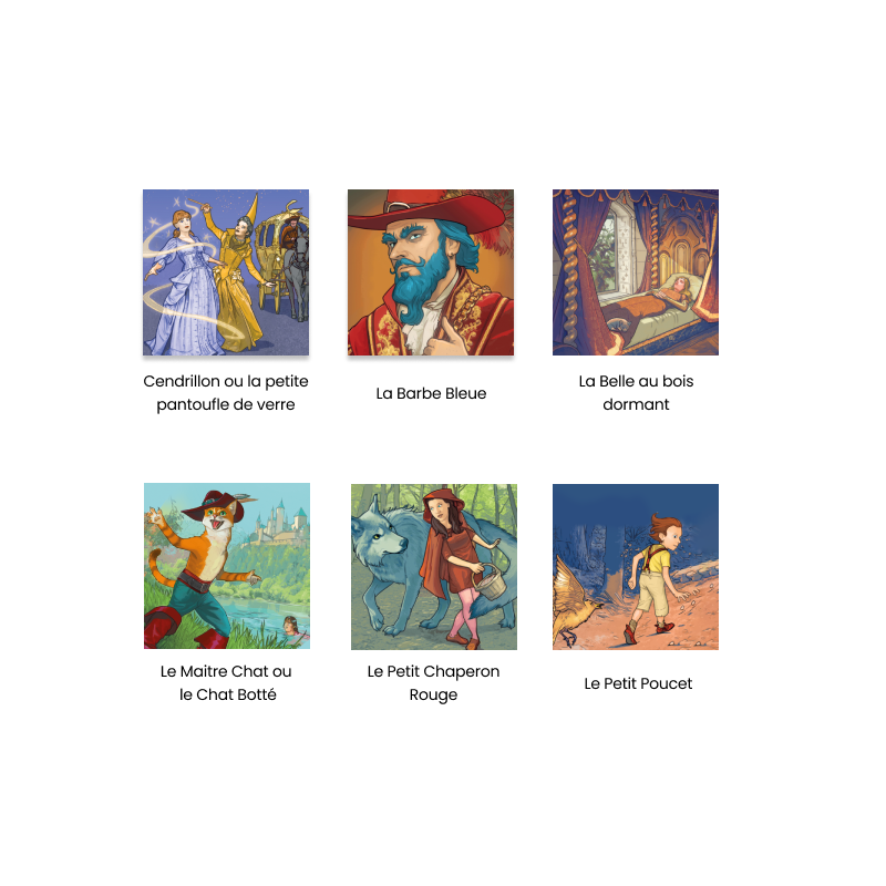 Cendrillon ou la petite pantoufle de verre, La Barbe Bleue, La Belle au bois dormant, Le Maitre Chat ou le Chat Botté, Le Petit Chaperon Rouge, Le Petit Poucet, Riquet à la houppe, Hansel et Gretel…