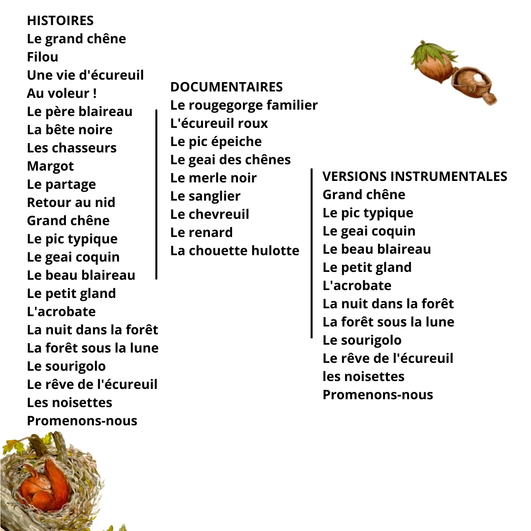 1 grande histoire, celle de Filou l’écureuil à qui l’on a volé ses glands, suivie de 9 documentaires sur les animaux de la forêt, et de 12 musiques originales en version instrumentale entendues au cours de l’histoire.